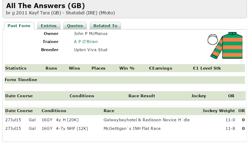 Outstanding is unbeaten as a 3 year old, she was last seen winning the Oaks Trial A Listed Contest at Naas On The 24th of June she Broke her maiden at the same track on May 13th.